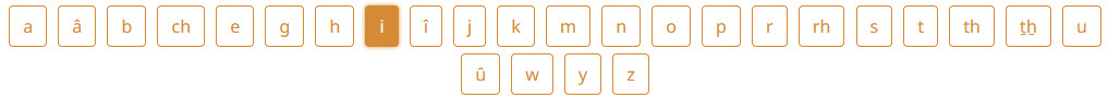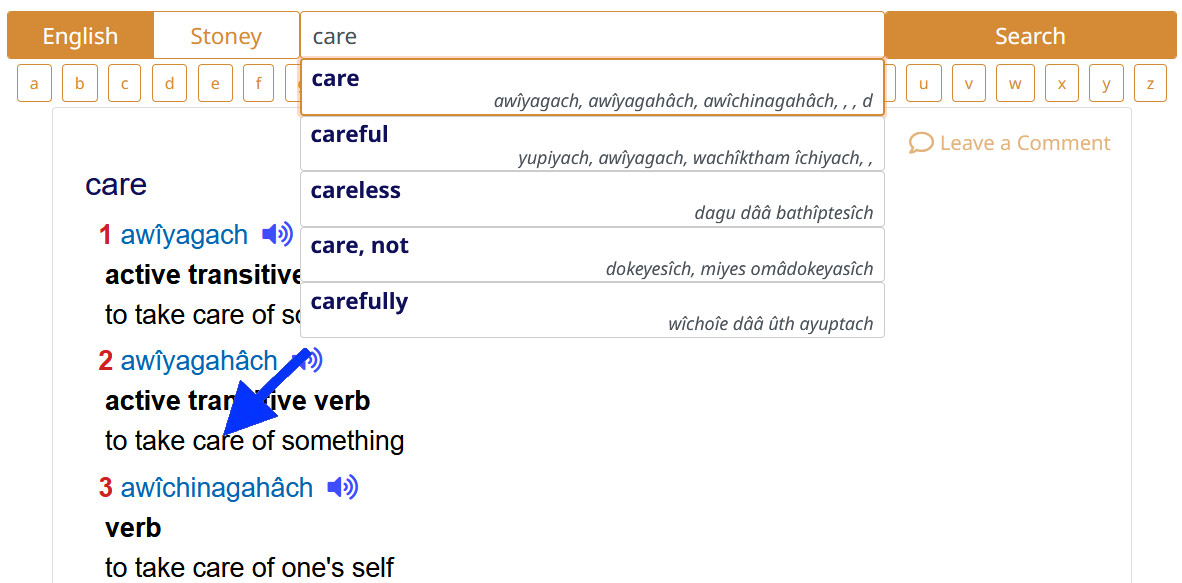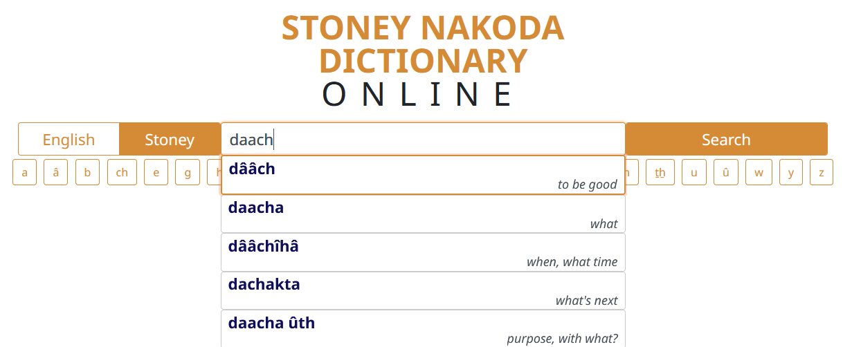 Selecting Stoney enables searching in the Stoney language. It also sets the alphabet to only include letters used in Stoney. Searching in Stoney will allow you to access dictionary entries directly. Click a letter to start browsing or start typing to search. A virtual Stoney keyboard appears at the bottom at the page and your keyboard becomes the Stoney keyboard as you start typing.